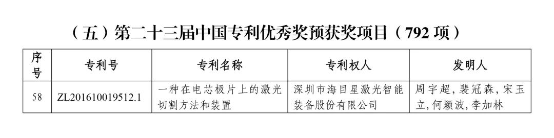 近日,國(guó)家知識(shí)產(chǎn)權(quán)局發(fā)布第二十三屆中國(guó)專利獎(jiǎng)的評(píng)審結(jié)果公示,深圳市海目星激光智能裝備股份有限公司的《一種在電芯極片上的激光切割方法和裝置》榮獲中國(guó)專利優(yōu)秀獎(jiǎng)。